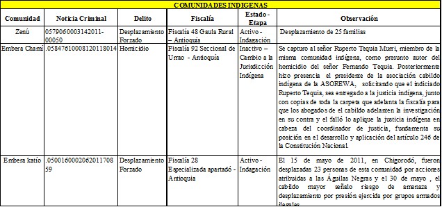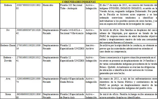 55Pese a lo que informó el Ministerio de Educación Nacional, el 13 de enero de 2012, respecto al “fortalecimiento y expansión de los programas etno-educativos, propios comunitarios e interculturales”, en respuesta a las necesidades educativas que se pretenden atender en los diferentes planes de salvaguarda étnica.
